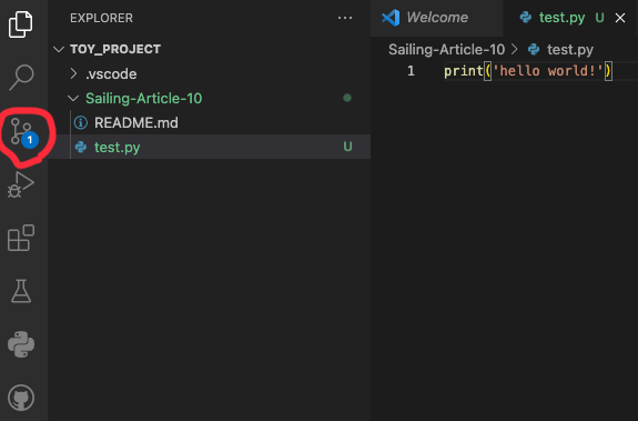 <git clone 이후 복사된 폴더에 test.py 생성한 후의 vscode 화면>