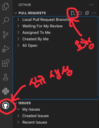 <하단 이미지 좌측, Github Pull Resquests 아이콘 및 pull requests 요청을 위한 버튼 표기 >