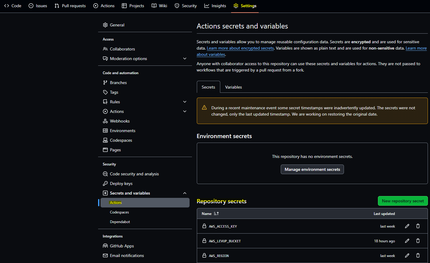 위 경로로 들어가면 프로젝트 구현 시 .env를 사용하는 것 처럼 저장한 변수를 Action 작성에 활용할 수 있다.