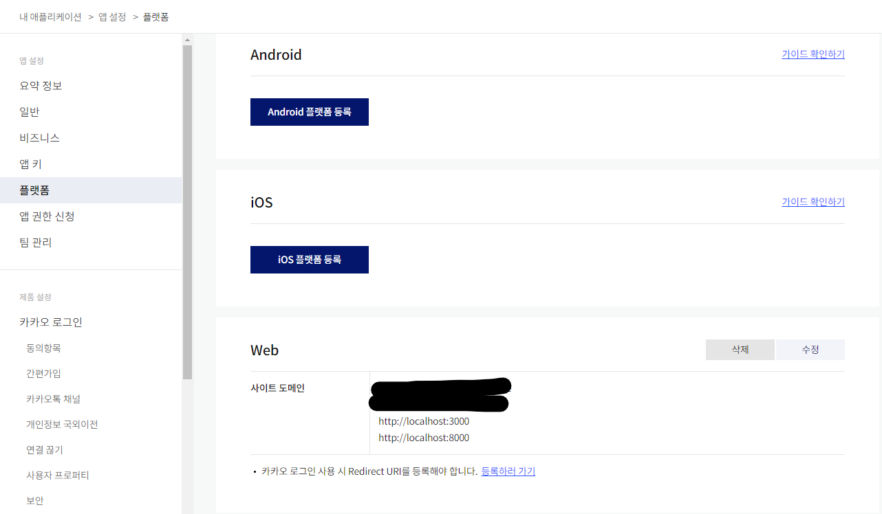카카오 아이디 로그인을 위한 사전 준비는 끝난다.