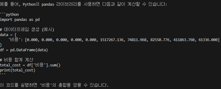 req= f"다음 데이터의 비용 행 합을 구하시오 \n {test_data} "