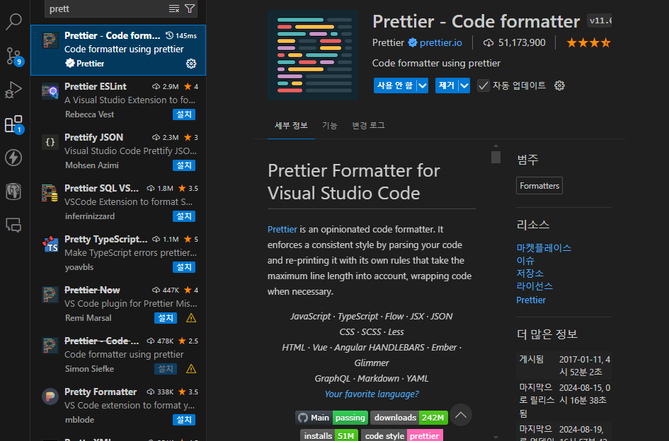 Prettier - Code formatter 확장을 설치합니다.